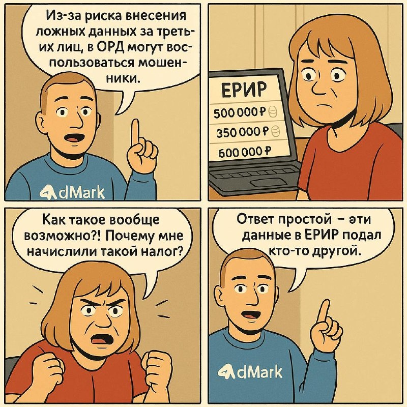 ☝️ Из-за риска внесения ложных данных за третьих лиц, в ОРД могут запретить передачу атрибутов (стоимость) по договорам и актам где владелец кабинета не является участником цепочки. Так сейчас любой желающий может зарегистрироваться в ОРД, и ввести несуществующий данные на блогера с последующим начислением 3% налога. Этим обязательно воспользуются мошенники желая насолить неугодным блогерам. Представим ситуацию… Блогер Анна — опытная, внимательная. Ведёт Telegram-канал, сотрудничает с брендами, маркирует рекламу и отправляет отчёты в ЕРИР, как положено. В июле она, как обычно, зашла в личный кабинет ЕРИР, чтобы проверить начисления за второй квартал. И вдруг видит — сумма к уплате намного выше ожидаемой. 😠 Она открывает расчёт — и замечает несколько актов, которые она не передавала: • Договора с компаниями, с которыми не работала. • Креативы, которые не размещала. • А главное — с огромными суммами. 😡 Анна возмущена.... — «Как такое вообще возможно?! Я всё подаю сама, строго п