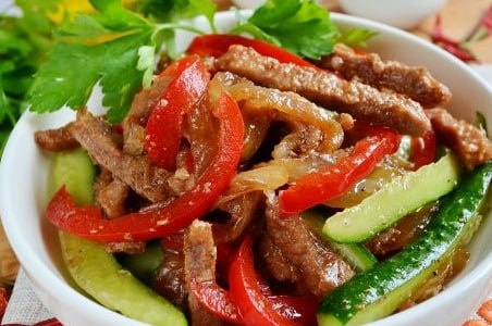 Ингредиенты: 🥒 Огурцы – 3 шт. 🥩 Говядина – 300 г 🧅 Лук – 1 шт. 🫑 Красный перец – 1 шт. 🧄 Чеснок – 2 зубчика 🌶 Красный и черный перец – 1 ч. л. 🍶 Уксус 9% – 1 ч. л. 🥢 Соевый соус – 2 ст. л. 🍚 Сахар – 0,5 ч. л. 🧂 Соль – 1 ч. л. 🛢 Масло растительное – 3 ст. л. 🔥 Приготовление: 1️⃣ Огурцы нарезать соломкой, посолить и оставить на 15 мин. 2️⃣ Говядину порезать брусочками, обжарить на масле, добавить лук, затем соевый соус, выпарить жидкость. 3️⃣ Смешать огурцы, перец, чеснок, специи, сахар, уксус и мясо с соком. 4️⃣ Перемешать и подать к столу. 👌 Вкусный, пряный, аппетитный! 😋