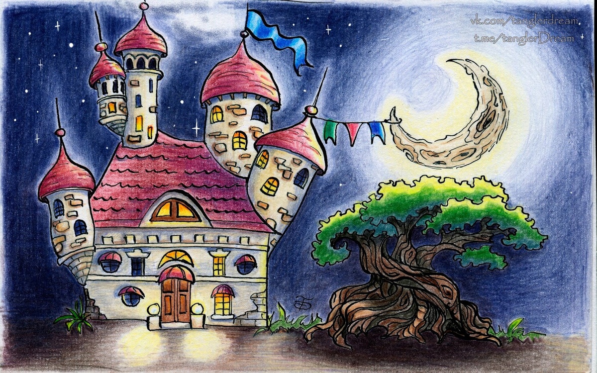 Всем привет! Немного сказочных почеркушек. Купила скетчбук для маркеров от Brauberg (с кедами на обложке, 160 гр/м2). Выяснилось, что для маркеров мне эта бумага не пошла, а вот для туши и карандашей - отлично. Делюсь результатом. В карусели - этапы от черно-белого варианта в туши до промежуточного этапа раскрашивания карандашами и волшебный дух птицы счастья из колбы😉😄. Карандаши из набора "Сборная солянка"😜 Всем счастья и вдохновения! #tangler #сказочное #замок #Луна #дерево #ночь #тушь #цветныекарандаши #fairytale #castle #Moon #tree #night #indianink #coloredpencils