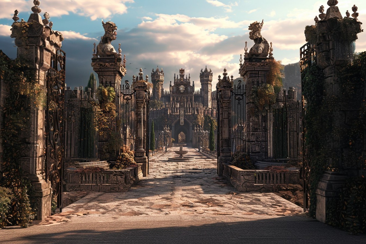 Создано на основе запроса: A richly detailed fantasy castle seen from the front, massive gates adorned with dragon motifs, intricate carvings, royal crest above the main tower. Surrounded by manicured stone courtyards and braziers. Evening light creates dramatic shadows. Created Using: photoreal render, baroque architecture, high-resolution textures, Renaissance-inspired structure, natural color grading, lens depth simulation, digital matte painting, HDR realism --- Автоперевод: Богально детальный фэнтезийный замок, который можно увидеть спереди, массивные ворота, украшенные мотивами драконов, сложными резьбами, королевским гребнем над главной башней. Отлично вышло? 🤔 https://dzen.ru/id/65c0c65c86e4f837c27b24d7 #ИИ #AI #нейросеть #midjourney #art