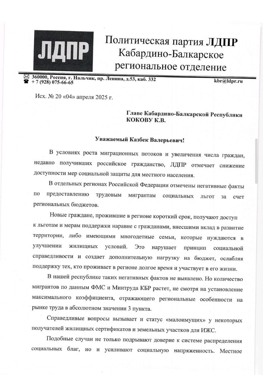 π’ ΠΠ°ΠΆΠ½ΠΎΠ΅ ΠΎΠ±ΡΠ°ΡΠ΅Π½ΠΈΠ΅ ΠΊ ΠΠ»Π°Π²Π΅ ΠΠ°Π±Π°ΡΠ΄ΠΈΠ½ΠΎ-ΠΠ°Π»ΠΊΠ°ΡΡΠΊΠΎΠΉ Π Π΅ΡΠΏΡΠ±Π»ΠΈΠΊΠΈ! ΠΠΎΠΎΡΠ΄ΠΈΠ½Π°ΡΠΎΡ ΠΠ°Π±Π°ΡΠ΄ΠΈΠ½ΠΎ-ΠΠ°Π»ΠΊΠ°ΡΡΠΊΠΎΠ³ΠΎ ΡΠ΅Π³ΠΈΠΎΠ½Π°Π»ΡΠ½ΠΎΠ³ΠΎ ΠΎΡΠ΄Π΅Π»Π΅Π½ΠΈΡ ΠΠΠΠ ΠΠ»Π°Π΄ΠΈΠΌΠΈΡ ΠΠ΅Π·Π³ΠΎΠ΄ΡΠΊΠΎ Π½Π°ΠΏΡΠ°Π²ΠΈΠ» ΠΎΠ±ΡΠ°ΡΠ΅Π½ΠΈΠ΅ ΠΊ ΠΠ»Π°Π²Π΅ Π Π΅ΡΠΏΡΠ±Π»ΠΈΠΊΠΈ ΠΠ°Π·Π±Π΅ΠΊΡ ΠΠΎΠΊΠΎΠ²Ρ Ρ Π²Π°ΠΆΠ½ΠΎΠΉ ΠΈΠ½ΠΈΡΠΈΠ°ΡΠΈΠ²ΠΎΠΉ. Π‘ ΡΡΠ΅ΡΠΎΠΌ ΡΠΎΡΡΠ° ΠΌΠΈΠ³ΡΠ°ΡΠΈΠΎΠ½Π½ΠΎΠ³ΠΎ ΠΏΠΎΡΠΎΠΊΠ° ΠΈ ΡΠ²Π΅Π»ΠΈΡΠ΅Π½ΠΈΡ ΡΠΈΡΠ»Π° Π³ΡΠ°ΠΆΠ΄Π°Π½, Π½Π΅Π΄Π°Π²Π½ΠΎ ΠΏΠΎΠ»ΡΡΠΈΠ²ΡΠΈΡ