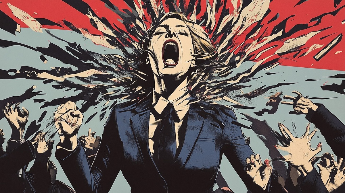 Создано на основе запроса: Satirical political illustration showing a press conference where words materialize as sharp, broken glass shards flying through the air, audience members either shielding themselves or cheering wildly; the press secretary depicted with exaggerated, twisted charisma, wearing a polished suit, but with shadowy tendrils weaving from her mouth, symbolizing manipulation and aggressive communication --- Автоперевод: Сатирическая политическая иллюстрация, показывающая пресс -конференцию, на которой слова материализуются как острые, разбитые стеклянные осколки, летящие по воздуху, зрители либо защищают себя, либо дико подбадривают; Как тебе вариант? 🤔 https://dzen.ru/id/65c0c65c86e4f837c27b24d7 #ИИ #AI #нейросеть #midjourney #art