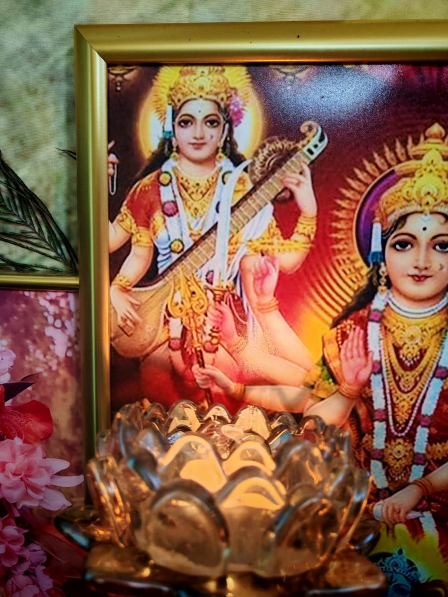 Почитаем Сарасвати! Божество, управляющее речью, разумом, знанием, мудростью, [шакти] Высочайшего духа, (29) Имеющая природу полного знания – это богиня Сарасвати. Она разум, поэтический дар, проницательность, талант, память, присущие людям. (30) Она дает возможность выделить суть разнообразных [текстов] сиддханты, И она, устранительница всех сомнений, предстает в образе объяснения и понимания. (31) Эта шакти покровительствует размышлениям и написанию книг И является как соединение нот, такта и пения. (32) Являющаяся в образе речи, обладающая знанием в [различных] областях, благодаря которой живут все [существа], Покровительствующая объяснениям и спорам, держащая вину и книгу, (33) Почитаем Сарасвати завершается Наваратри. Завтра, 6 апреля, последний день Наваратри
