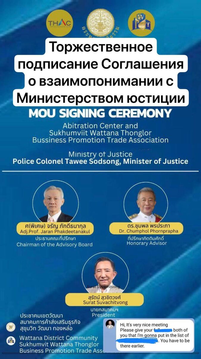 В ответ на пост Мы рады сообщить о скором подписании Меморандума о взаимопонимании (MOU) с центром Арбитража. Наши услуги: ✅ Арбитражное урегулирование споров – быстро, эффективно и конфиденциально. ✅ Юридическое сопровождение бизнеса – от консультаций до защиты ваших интересов. Открытие компаний в полную иностранную собственность. ✅ Поддержка в развитии торговых и деловых связей по всему Таиланду. ✅ Представительство в суде и защита ваших интересов. ➡️ Записаться на консультацию и анализ дела @alina_nirah ➡️Скидки 20% в честь Дня Династии Чакри и Сонграна #Арбитраж #Бизнес #SukhumvitWattanaThonglor #МинистерствоЮстиции #Таиланд