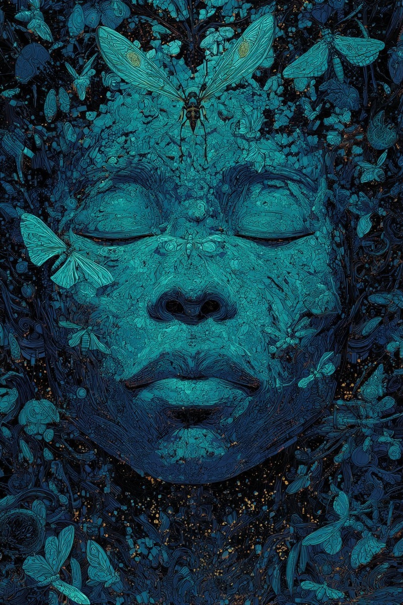 Создано на основе запроса: the sleeping face of the night queen, evil, composed of insects, asian motifs, cool colors, dark skin, highly detailed, sharp focus, illustration, 8K, beautiful oil painting, elaborate, dark atmosphere, atmospheric, by James R. Eads and Pixar --- Автоперевод: Спящее лицо ночной королевы, зло, состоит из насекомых, азиатских мотивов, прохладных цветов, темной кожи, высоко детальной, острой фокусировки, иллюстрации, 8K, красивой масляной живописи, сложной, темной атмосферы, атмосферы, Джеймса Р. Идса и Пиксара Неплохо получилось? 🤔 https://dzen.ru/id/65c0c65c86e4f837c27b24d7 #ИИ #AI #нейросеть #midjourney #art