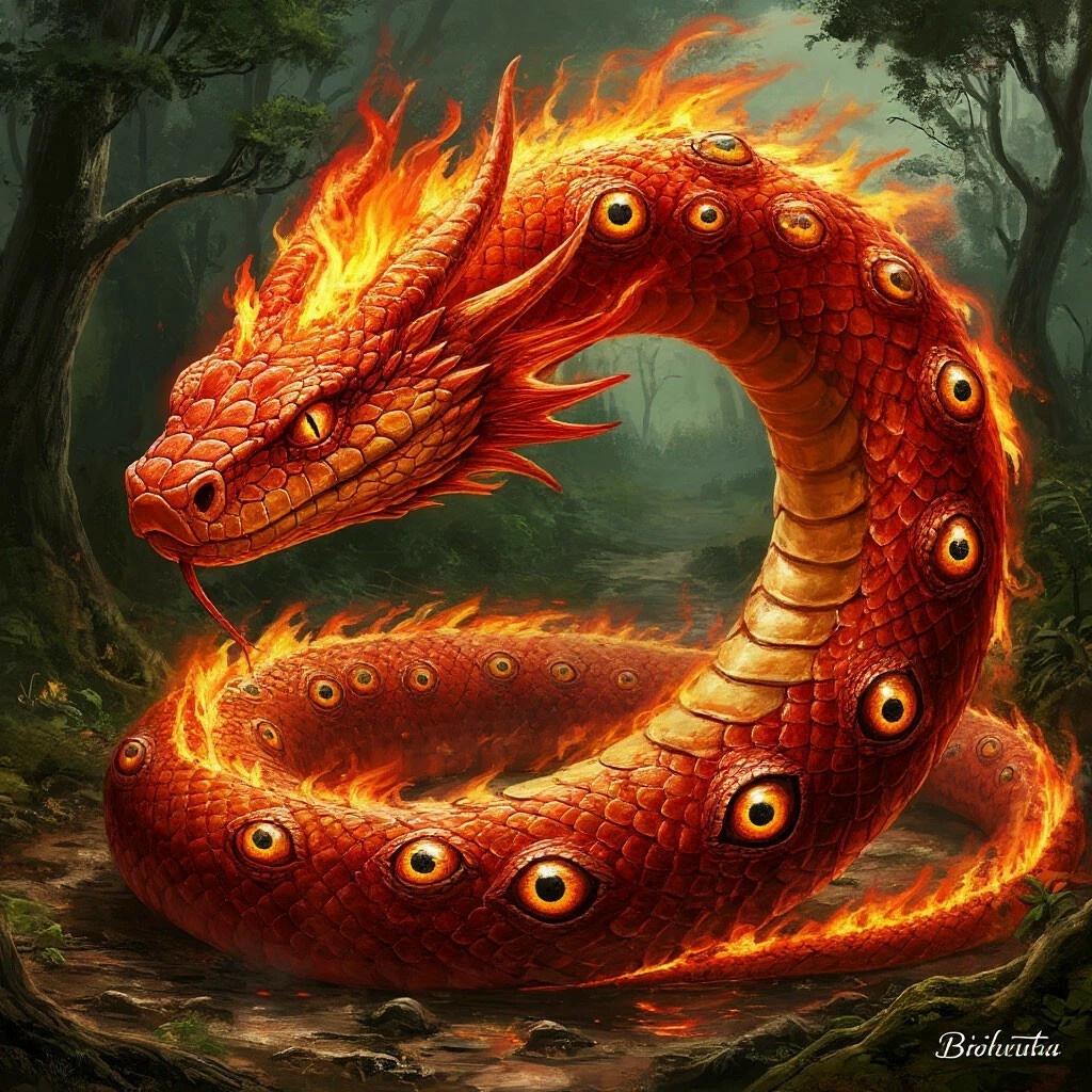"Бойтата - гигантская огненная змея, тело которой покрыто глазами ее жертв. Выползает на охоту всегда на закате дня. Когда в глазах жертвы отражается огонь заходящего светила, появляется древняя демоница. Взглянув на человека, она отбирает зрение, и на ее теле появляются два новых глаза, усиливающих ее магию и служащие своеобразным источником питания. Забрав зрение у тысячи человек, змея уходит в глубокую нору, где вынашивает своих детёнышей как гадюка. Внутри нее созревают яйца, рождаясь, маленькие змееныши покидают тело матери".