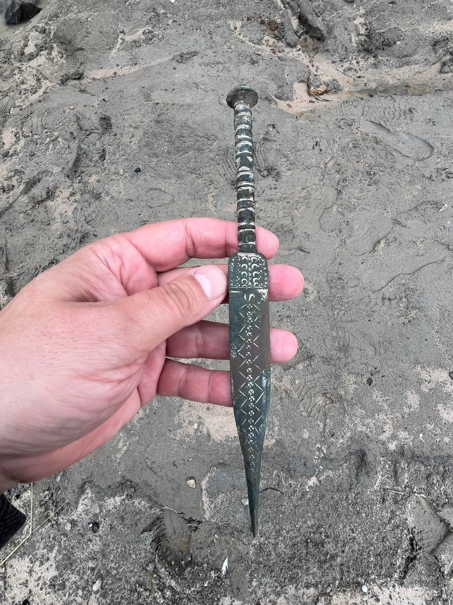 Несколько дней назад на балтийском побережье Польши разразился мощный шторм, который, видимо, обрушил целый пласт прибрежного грунта. По счастью неподалёку оказались волонтёры местной ассоциации по сохранению памятников, Яцек Уковски и Катажина Херджик. 30 марта вскоре после шторма они обнаружили замечательно сохранившийся бронзовый кинжал в куске глины, выпавшем из обрывистого берега. Волонтеры сразу обратились к директору историко-краеведческого музея города Камень Поморски. Сам по себе кинжал не очень большой: его общая длина составляет около 24 см, из которых чуть меньше половины приходится на рукоять. Артефакт относится к знаменитой гальштатской археологической культуре, носителями которой были преимущественно кельты. Датируется он ранним железным веком ー примерно IX-VII веками до н.э. Сразу бросается в глаза то, насколько оружие изысканно и богато украшено. Навершие кинжала имеет довольно простую, грибовидную форму. Чередующиеся узкие и широкие полосы на рукояти формируют ребрист