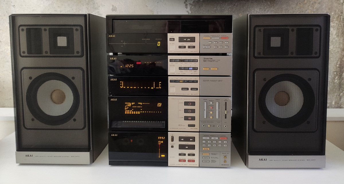 AKAI AT-M77 - Стереотюнер AKAI AM-M55 - Усилитель мощности Akai HX-M77R - кассетная дека AKAI AP-M77 - Программируемый проигрыватель виниловых пластинок AKAI SW-M77 - акустические системы При взгляде на эту технику сразу бросается в глаза стилевое отличие от миди hi-fi вышеупомянутых брендов. Что мы видим? Прежде всего абсолютно новое решение - тонированное остекление половины фронтальной панели, причем в выключенном состоянии оно настолько глухое, что абсолютно не видно функционала. Однако нажав кн