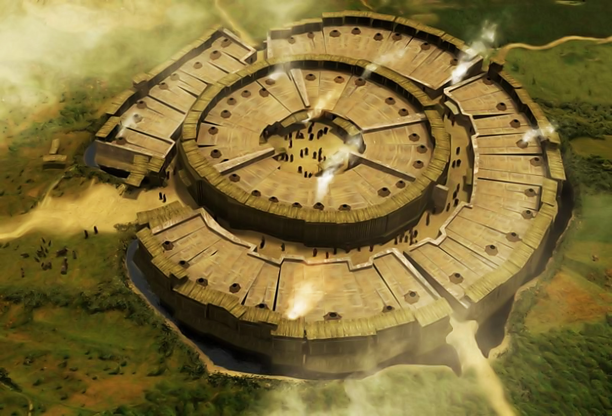 ✔ Имеет строгую круговую структуру — как модель Вселенной Аркаим построен в виде двух вложенных колец с центральной площадью: 🔵 Внешний круг (диаметр 145 м) — жилые дома и мастерские