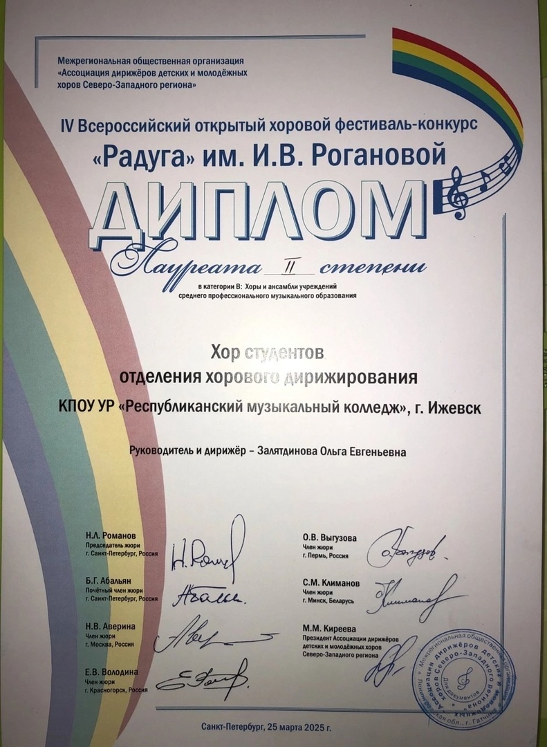 С 20 по 27 марта хор студентов отделения хорового дирижирования под руководством Ольги Евгеньевны Залятдиновой блистал на IV Всероссийском открытом фестивале-конкурсе "Радуга" им. И.В. Рогановой в Санкт-Петербурге. И вот результат — мы лауреаты II степени! Это не просто награда, а признание высокого мастерства, слаженности и вдохновенного труда всего коллектива. Отдельная благодарность нашим наставникам: