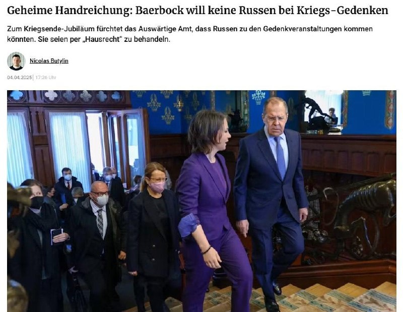 Если русских, белорусов и бывших граждан СССР будут выдворять с мероприятий в честь 9 Мая в ФРГ, это станет «возрождением нацизма», заявила Мария Захарова. Ранее Berliner Zeitung написала, что немецкий МИД рекомендовал не приглашать официальных представителей России и Белоруссии на памятные мероприятия. В статье также говорится, что приглашение российских и белорусских представителей со стороны государства, земель и коммун недопустимо. Если же они придут сами, их могут выдворить. «В год 80-летия Победы Анналена Бербок и её аппарат продолжают воссоздавать используемые нацистами бесчеловечные практики», — подчеркнула @MariaVladimirovnaZakharova. 🟩 Подписаться | Прислать новость | Читать аналитику