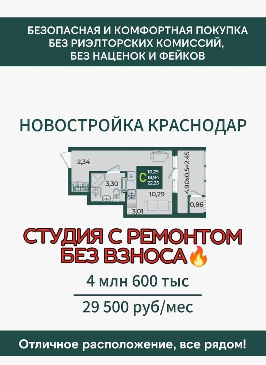 АКЦИЯ на новостройку в классном районе Краснодара‼️‼️🤩 🎁Ремонт в подарок и субсидия за счет застройщика (поэтому дешевле 👍) Прайс с ремонтом 4 628 000 руб Первоначальный взнос 0 руб 🔥 Платеж 29 582 руб/мес Со мной ваши возможности гораздо шире: ✅большой выбор; ✅возможность сравнения; ✅согласование нестандартных условий покупки; ✅сопровождение на всех этапах покупки; ✅дистанционный просмотр; ✅безопасность; ✅комфорт #жккраснодара #акциянановостройку #студиясремонтомкраснодар #студиякраснодар #студиябезвзносакраснодар #купитьстудиюкраснодар #недвижимостькраснодар #переездкраснодар