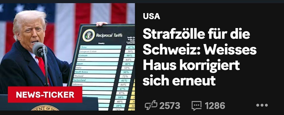 📌 Карательные тарифы для Швейцарии: Белый дом поправил себя. 32 или 31 процент? Всего через несколько часов после того, как президент США Дональд Трамп представил свои новые тарифы, возникла путаница: на листке по-прежнему значилось, что Швейцарию ожидает тарифная ставка в размере 31 процента. В официальном указе, то есть в юридически обязывающем постановлении о введении тарифов, Швейцария указана с другим значением - 32 процента. На данный момент ситуация прояснилась: Белый дом опубликовал пересмотренный список стран. В нем Швейцария значится с номером в 31 процент. Пока неясно, как получилось такое отклонение. Цифры по другим странам также были скорректированы. #Швейцария #сша