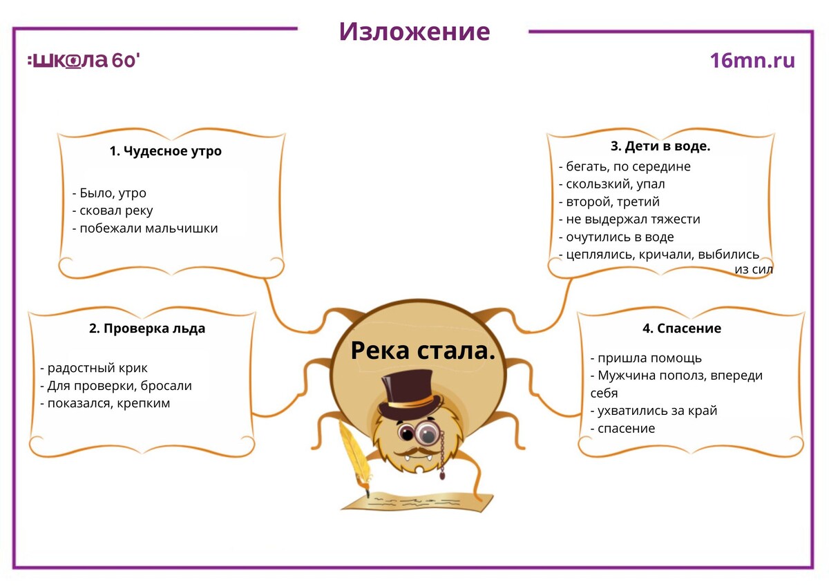 Как научиться писать изложения. И зачем это нужно. Умение писать изложения пригодится на ОГЭ по русскому языку, т.к. на этом экзамене изложение - обязательная часть. Кажется, что до ОГЭ еще так много лет …. но и научится писать изложения - дело нелегкое и занимает не один год. Цели изложений: В начальной школе все изложения - обучающие. Разберем алгоритм написания изложения на примере текста для 4 класса. Река стала. Было чудесное утро. Мороз сковал реку. К речке побежали мальчишки со всей деревни. Ребята подняли радостный крик. Для проверки льда мальчики бросали камни, ветки. Лед показался им крепким. Трое ребят стали бегать по самой середине речки. Лед был скользкий, и один мальчик упал. На него упал второй, третий. Лед не выдержал тяжести. Дети очутились в воде. Они цеплялись за тонкий лед, кричали, но вскоре совсем выбились из сил. На крик пришла помощь. Мужчина пополз по льду, толкая впереди себя длинную доску. Ребята ухватились за край доски. Это было спасение. Текст всегда читае