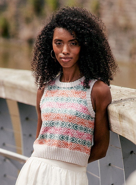Он связан спицами √3 из пряжи Rowan's Summerlite, которая является мягкой, матовой хлопчатобумажной пряжей, доступной в 34 оттенках, включая пастельные и яркие цвета. Этот топ идеально подходит для ношения поверх футболок или свободных блузок. Пряжа легко стирается в машине, что делает ее удобной для повседневного использования.