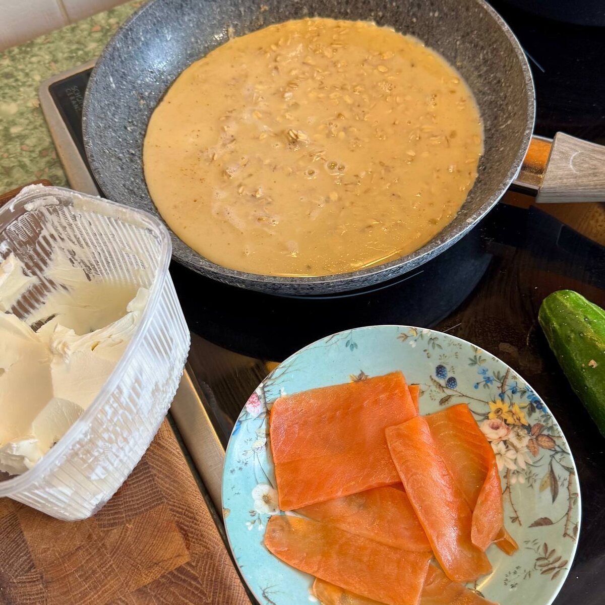 Доброе утро! ☀️ А сегодня я приготовил на завтрак Овсяноблин! 🥞 Ингредиенты - Овсяные хлопья 3 ст.л. - Молоко 50 мл - Яйцо 2 шт - Соль пр вкусу - Масло для жарки Приготовление 1. В глубокой миске смешайте овсяные хлопья, молоко, соль, яйца и оставьте на 10-15 минут. 2. Разогрейте сковороду с небольшим количеством масла на среднем огне. 3. Вылейте тесто на сковородку и накройте крышкой, готовьте 5-7 минут с одной стороны. 4. Выложите вашу любимую начинку (в моем случае красная рыба, творожный сыр и огурец) Приятного аппетита!❤️