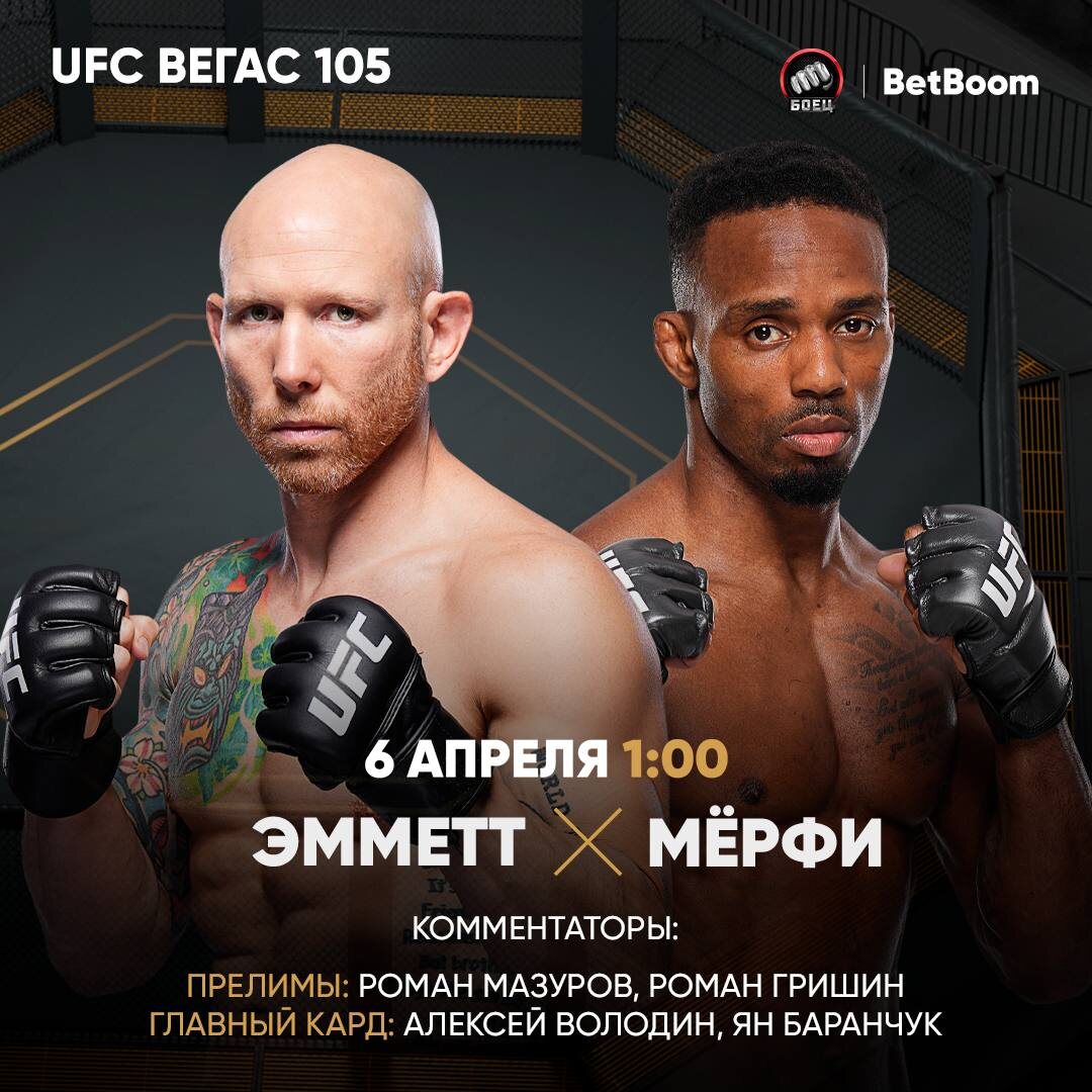 Новая неделя – новый турнир UFC 👊 В этот раз промоушен отправится в Лас-Вегас на арену Апекс. Здесь пройдет уже 105-й ивент организации 👀 В главном событии сойдутся два представителя топ-10 полулегкого веса. Эмметт возвращается в клетку после убойного нокаута в бою с Митчеллом. Его соперником станет Мёрфи, который по-прежнему не знает поражений в профессиональной карьере 🔥 Во втором по важности поединке встретится еще одна пара полулегковесов. В октагоне сойдутся Сабатини и Брито. Бразилец попытается закрыть поражение от Гомиса, а Пэт постарается выйти на серию побед ⚔️ Также в этом карде дебютируют два непобежденных бойца. Финни и Гуруле постараются сохранить нолики в графе поражений ✅ Трансляция начинается в 1:00 по московскому времени на канале Матч!Боец 📺 👉 ССЫЛКА НА ТРАНСЛЯЦИЮ 👈 🔥 Получи бесплатную ставку 1 000 ₽ от BetBoom по ссылке ❗️Кэфы на главный бой - 3.43 х 1.28 Информация об организаторе, правилах проведения акции, количестве призов по результатам акции, сро