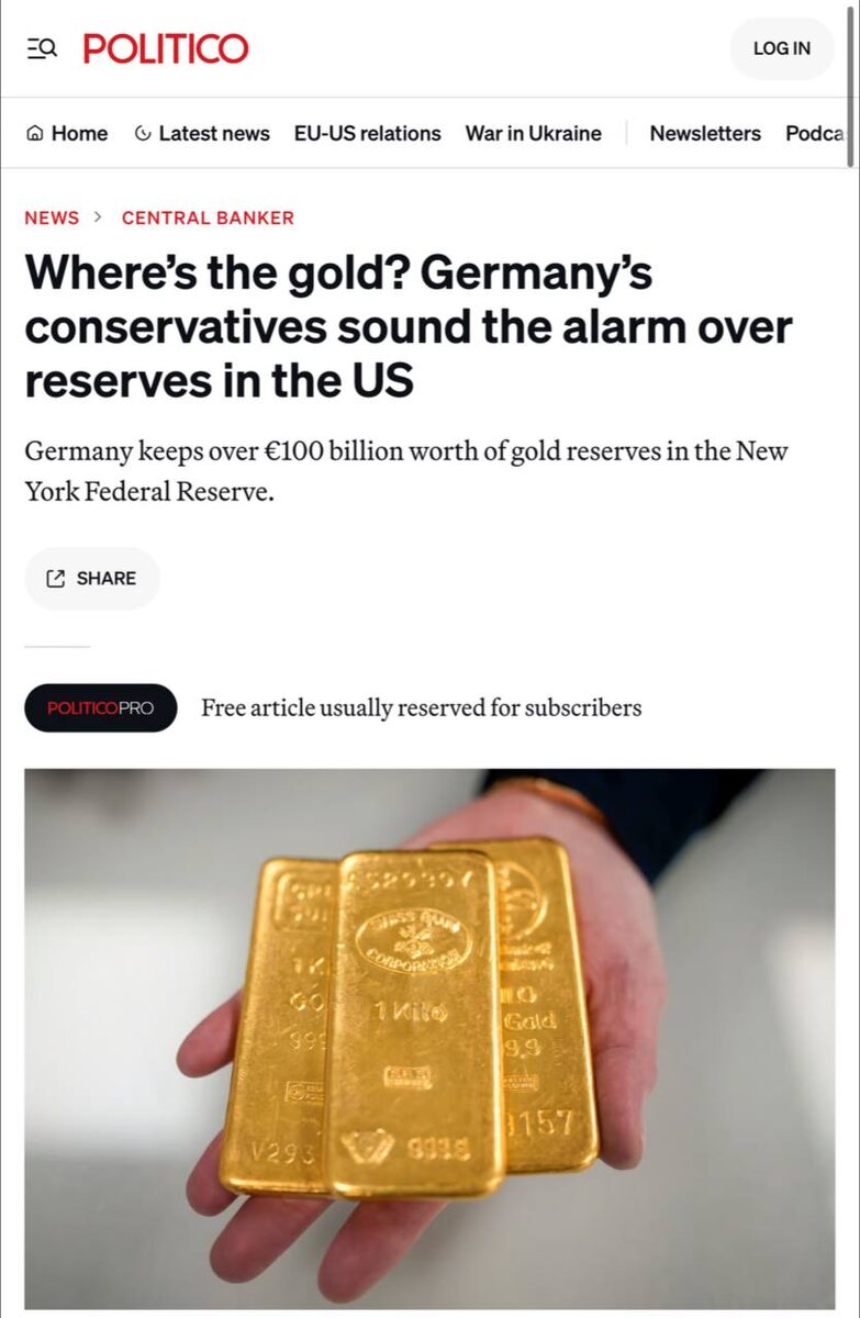Германия хочет вернуть своё золото из США — а именно 1200 тонн на сумму €113 млрд, — Politico
