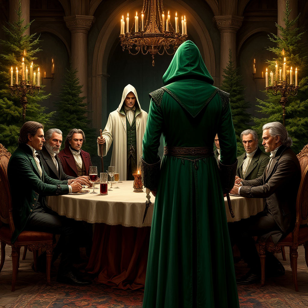 Несколько десятков людей разом обернулось и увидело небрежно шагающего к ним чернокнижника. Не смотря на статус всех собравшихся, в своей уверенной походке он словно возвышался над ними. Он был облачён в простой плащ тёмно-зелёного цвета, скреплённый на левой стороне груди медной бляхой. Его лицо оставалось скрытым за плотно натянутым капюшоном, как и правая рука, которая держалась где-то за подолом плаща. В левой же он сжимал перед собой увесистый кубок.