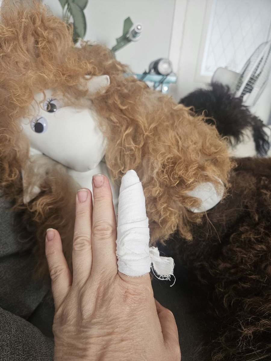 Производственная травма, развязывала козла, вернее веревки ращрезала,он дёрнулся и я ножницами полпальца срезала