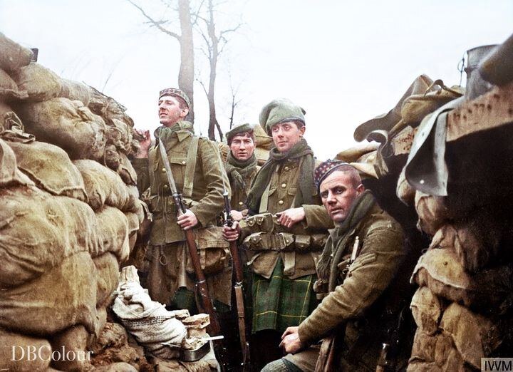 Солдаты королевского полка (Ливерпульский шотландский) в Синт-Элоой, примерно в 5 км к югу от Ипра, Бельгия, апрель-май 1915 года.