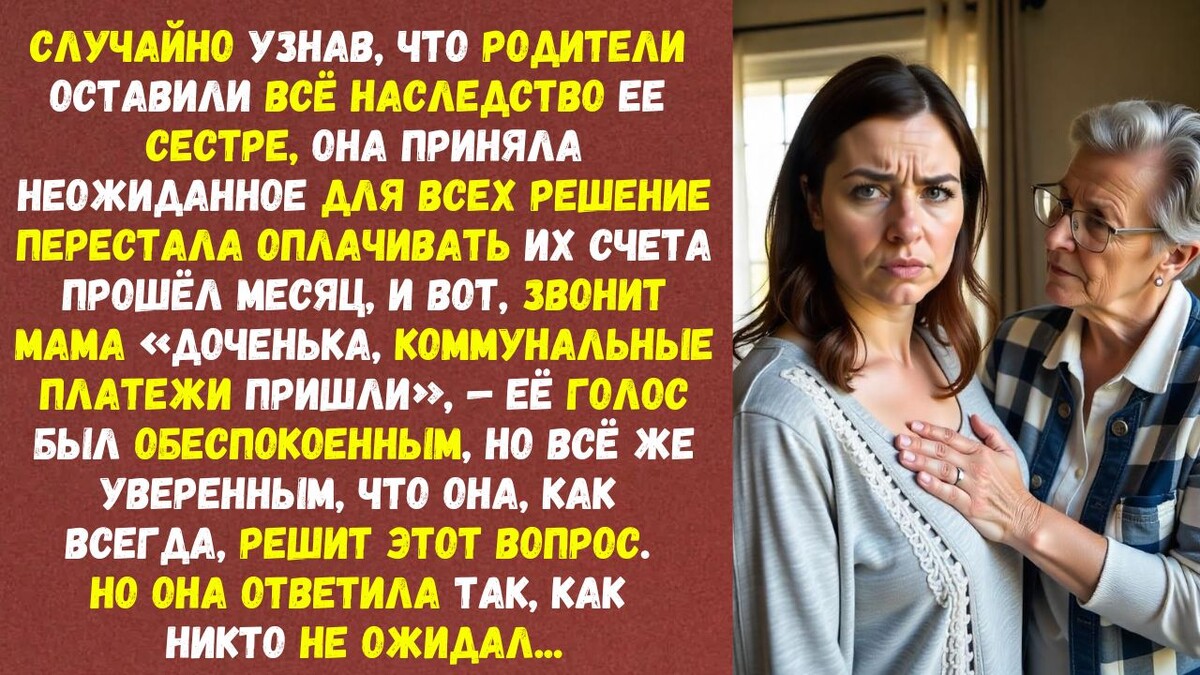 Случайно узнав, что родители оставили всё наследство ее сестре, она приняла неожиданное для всех решение: перестала оплачивать их счета. Прошёл месяц, и вот, звонит мама.