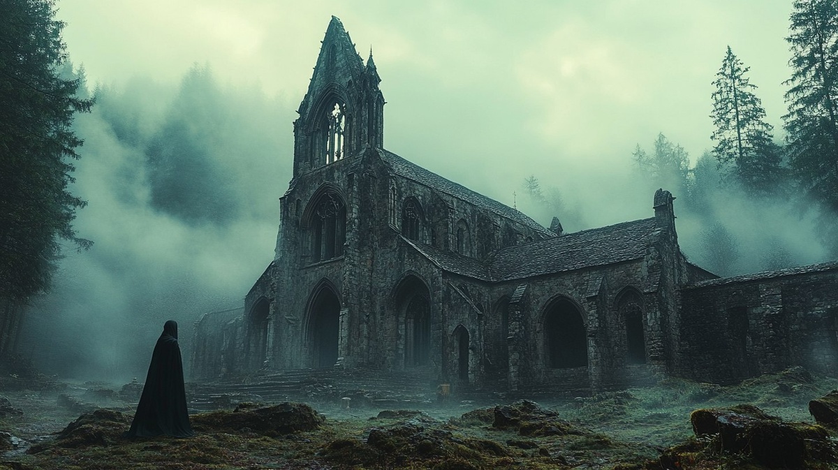 Создано на основе запроса: Cinematic shot, a remote medieval monastery shrouded in mist, deep in the dense forest, Gothic architecture