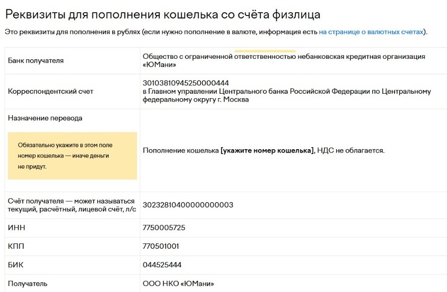 Пополнение кошелька Юмани с банковской карты другого банка.