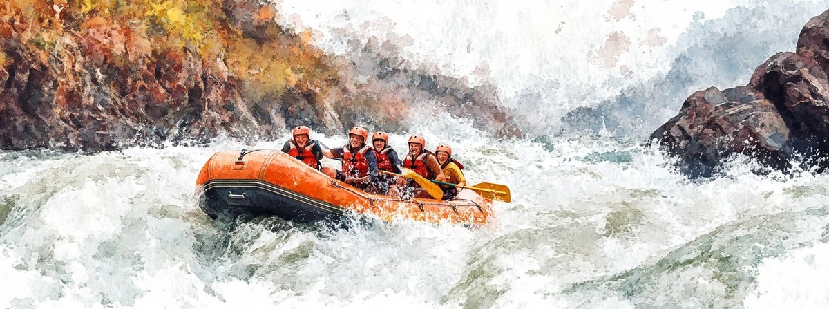 Создано на основе запроса: Draw an illustration of rafting on the Zambezi River through rapids in the style of watercolor painting high detail uneven white edges