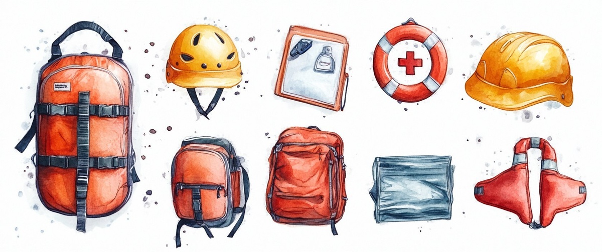 Создано на основе запроса: Draw equipment and inventory for safe rafting: first aid kit, helmets, life jackets in high-detail watercolor