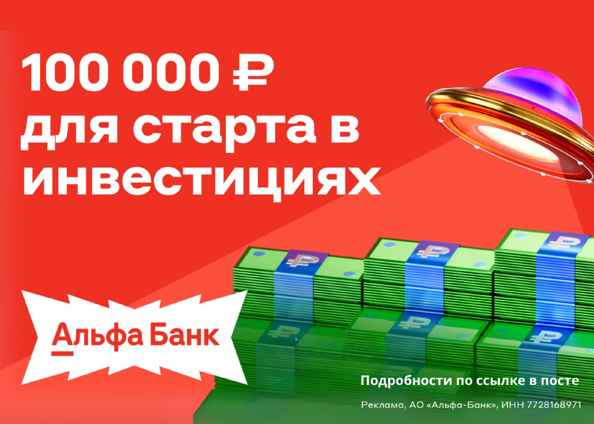 Получайте 100 000 ₽ для старта инвестиций. 💥 Гарантированный подарок для всех клиентов банка при открытии первого брокерского счета Как получить бонус: 1️⃣ Откройте первый бесплатный счёт для инвестиций по ссылке https://invest100k.prfl.me/6238cc608d70de4bf05c082d/84fsqn?erid=2VtzqupQT5s . 2️⃣ Купите портфель с акциями на виртуальные 100 000 ₽. 3️⃣ Купите любые ценные бумаги на сумму от 1000 ₽ за свои деньги, чтобы забрать прибыль. 4️⃣Продайте портфель и получите прибыль. До 1000 ₽ начисляются сразу, а остаток — частями, если продолжите инвестировать.