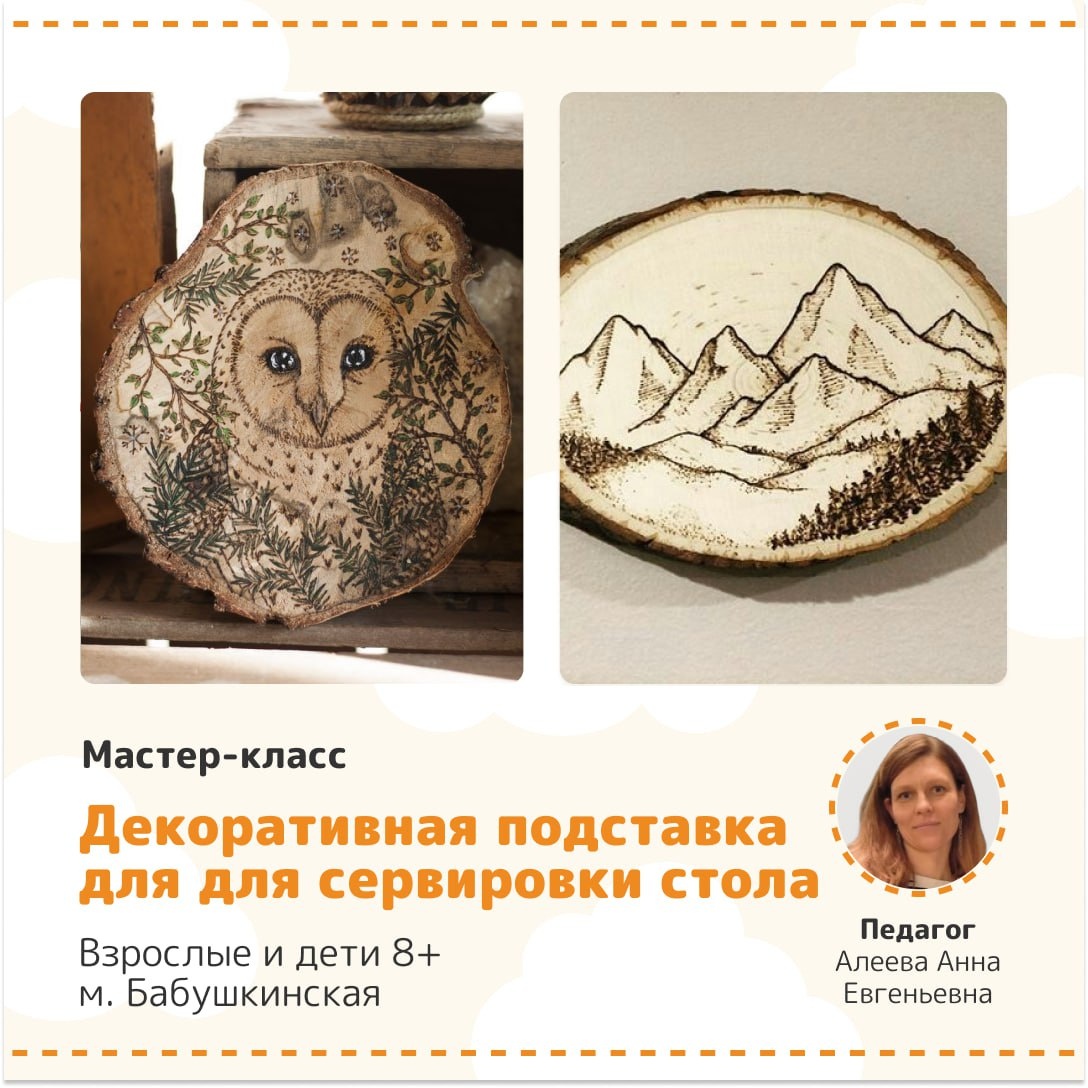 Горячий мастер-класс, но без ожогов!😜🔥 В следующую субботу на семейном мастер-классе мы будем работать с натуральными деревянными спилами, создавая стильные и практичные подставки под горячее.☕️ Вы научитесь не только техникам декорирования, но и как превратить обычный деревянный спил в красивую и оригинальную вещь, которая идеально подойдет для сервировки вашего стола. На мастер-классе будут предложены несколько вариантов композиции для выжигания. Участники могут также предложить свои идеи. Это замечательная возможность провести время с семьей, создать уникальные аксессуары для дома и вдохновиться на новые творческие проекты! Записывайтесь! 🔹12.04 (суббота) в 15.00 🔹Мастер - класс для детей 8+ и взрослых 🔹Продолжительность 1,5 часа 🔹м. Бабушкинская, ул. Искры, 9 корп. 2 🔹Все материалы предоставляются. Ведущая Алеева Анна Евгеньевна. 👉👉👉 Записаться Места ограничены. Записывайтесь и зовите друзей. Анонсы ближайших событий #ближайшиесобытия