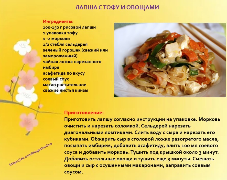 🥣 ЛАПША С ТОФУ И ОВОЩАМИ 🌀 Ингредиенты: 100-150 г рисовой лапши 1 упаковка тофу 1 -2 моркови 1/2 стебля сельдерея зеленый горошек (свежий или замороженный) чайная ложка нарезанного имбиря асафетида по вкусу соевый соус масло растительное свежие листья кинзы 🌀 Приготовление: Приготовить лапшу согласно инструкции на упаковке. Морковь очистить и нарезать соломкой. Сельдерей нарезать диагональными ломтиками. Слить воду с сыра и нарезать его кубиками. Обжарить сыр в столовой ложке разогретого масла, посыпать имбирем, добавить асафетиду, влить 100 мл соевого соуса и добавить морковь. Тушить под крышкой около 3 минут. Добавить остальные овощи и тушить еще 3 минуты. Смешать овощи и сыр с осушенными макаронами, заправить соевым соусом.
