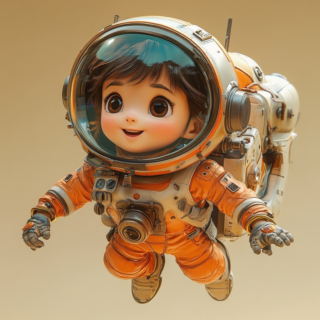 Создано на основе запроса: Ghibli style spaceship, flying, a little girl in an astronaut suit, rendered in cinema4d style, low saturation, playful character design, orange and bronze, solid background, clean background, cinematic lighting, solid color background