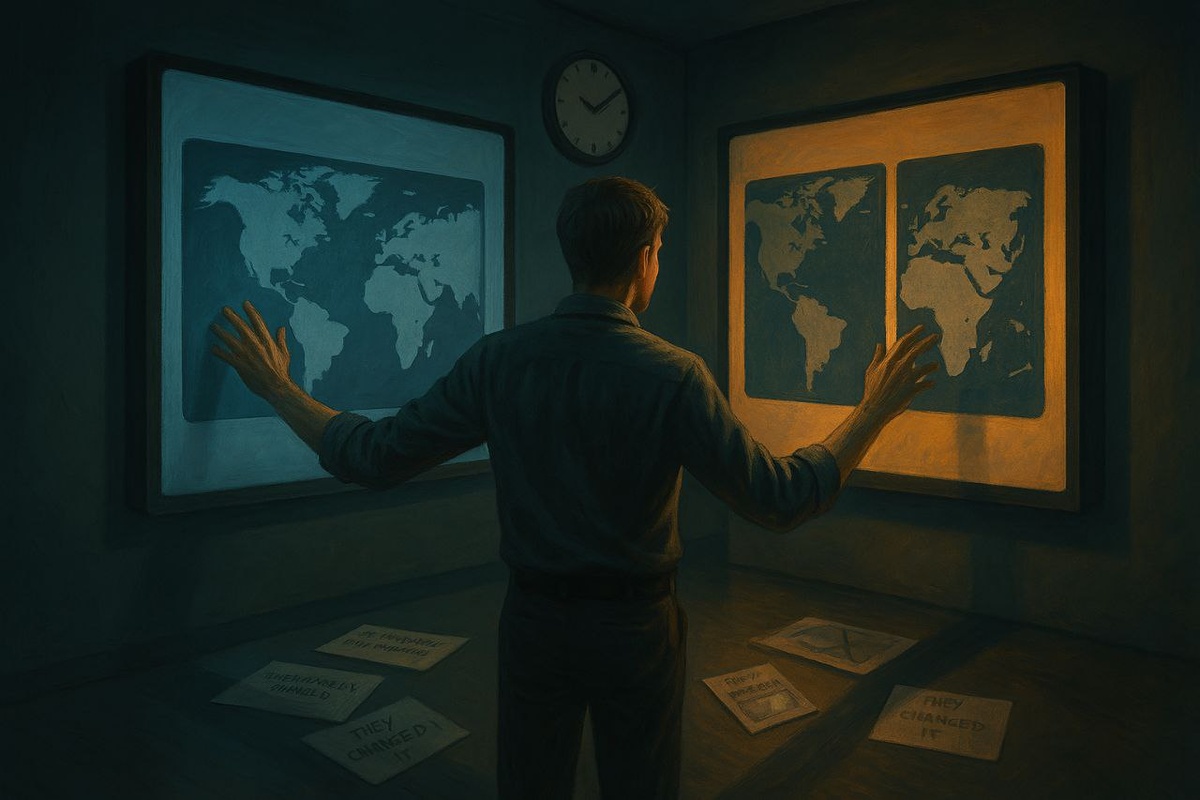 Когда реальность перестаёт быть очевидной. Мы живём среди знакомого. Каждый день — повторение привычного. Но однажды что-то не сходится. Логотип не тот. Фраза звучит иначе. Карта мира — как будто перестроена. И начинается сомнение: это мы забыли — или кто-то переписал? Мы вглядываемся в детали, пытаясь ухватить ускользающее. Но чем дольше смотрим — тем зыбче становится почва под ногами. В этот момент рождается пробуждение. Когда очевидное вдруг требует доказательств. Когда ты понимаешь: истина — не в том, что вокруг, а в том, что проскакивает между. #СлепаяЗона #эффектМанделы #реальность #наблюдение #психология #сомнение #восприятие