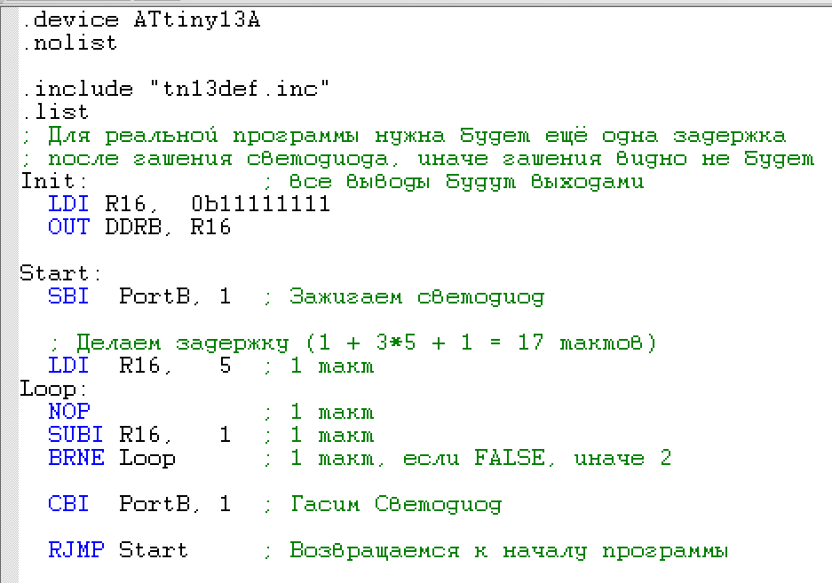Затем следует метка с именем Loop, которая нужна нам для организации цикла. В теле цикла мы вызываем один раз команду NOP, которая выполняется за один такт, а затем отнимаем единицу от содержимого регистра R16 командой SUBI, которая также занимает один такт.