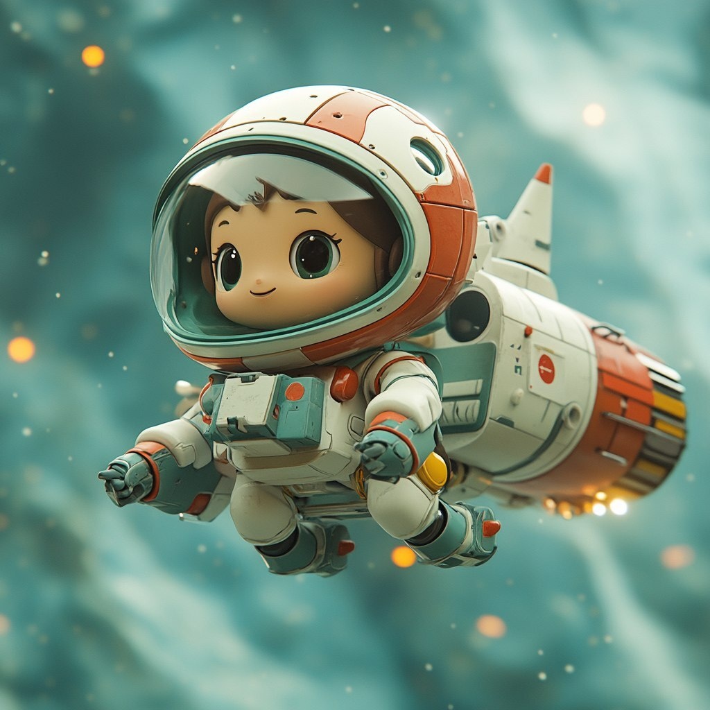 Создано на основе запроса: Ghibli style spaceship, flight, a little girl in astronaut suit, rendered in cinema4d style, low saturation
