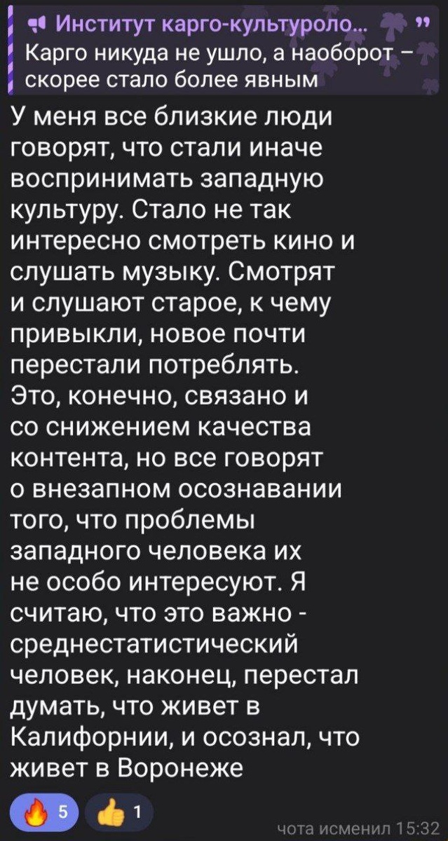 Этот процесс был запущен давно, ещё в 90-е. В отличие от поколения моих родителей (1950-е годы рождения), уже у моего поколения сильно упал уровень сакрализации западного масскульта. Дальше – больше. Я со сверстниками мог послушать Битлов или Роллингов, но уже без религиозного экстаза наших отцов. Из современной для того времени западной музыки у моего поколения гремели Продиджи или Кемикал Бразерс (из электроники, тогда это называлось «рейвом»), из гитарной музыки – Нирвана, из рэпа – Оникс. Однако аналогичным битлокульту отцов таинство прослушивания ломаных битов и/или гитарных риффов не было: да, «качает музяка», «норм лабают ребята, весело-задорно», но не более. Потребление западной музыки перестало проходить по разряду элитного потребления. Редкие, привозимые из «тех стран», виниловые пластинки сменили штампуемые пиратами аудиокассеты с бутлежными альбомами а-ля ПРОЛЕЖНИ 1000% ХИТЫ, которые переписывались у знакомых (в сфере кино – см. видеосалоны и распространение видаков). Ср