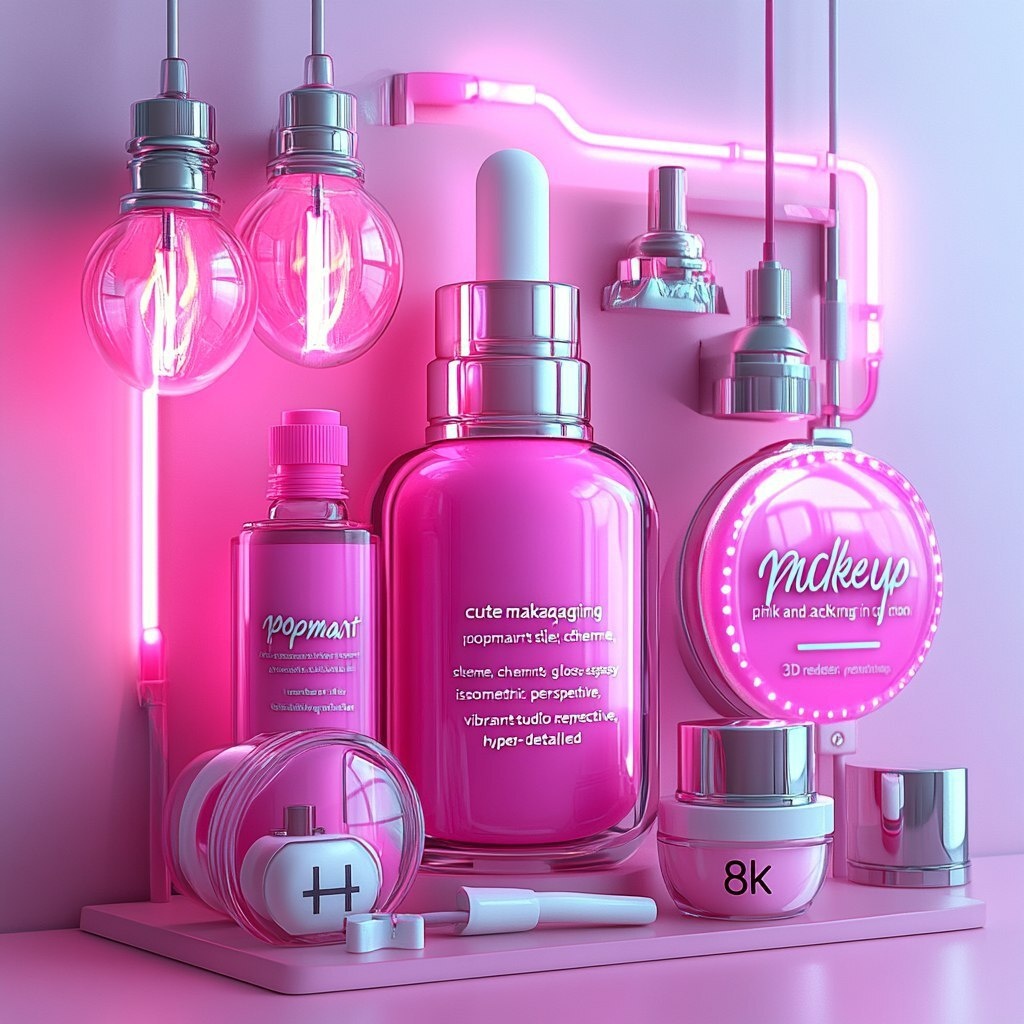 Создано на основе запроса: "cute makeup packaging in popmart style, pink and neon green color scheme, charging plug shaped bottle with pixel