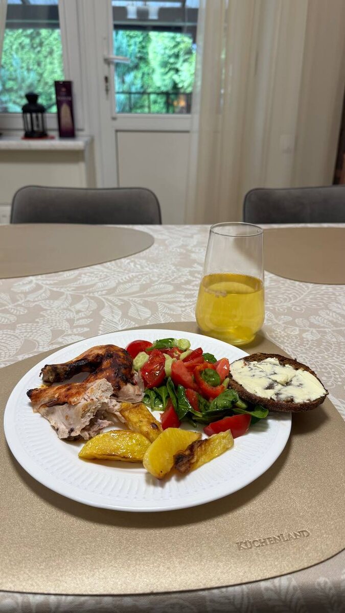На обед: овощной салат с бальзамиком, запеченный картофель и цыпленок, гренка со сливочным маслом и гречишный напиток✅