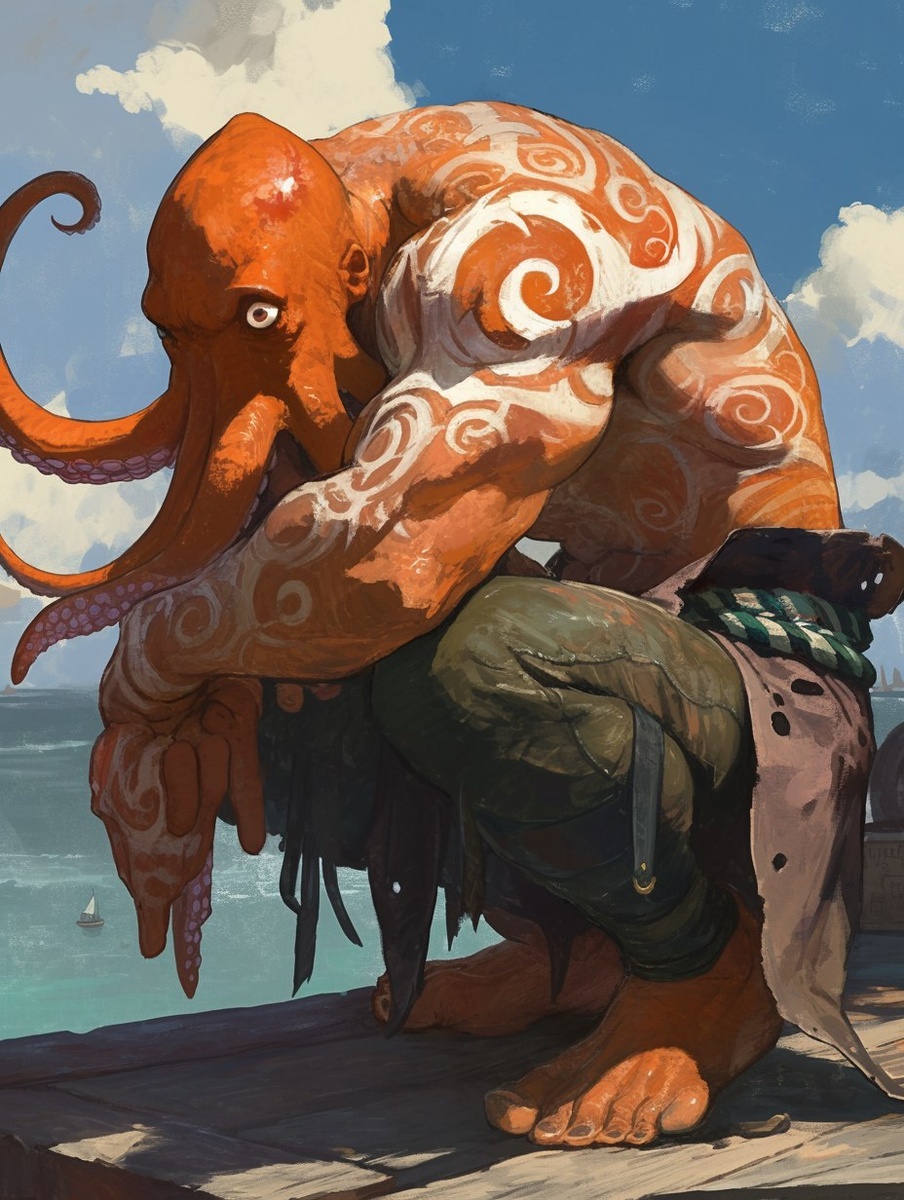 Создано на основе запроса: portrait of an anthropomorphic bipedal octopus with orange skin and covered in white tattoos of swirling patterns, muscular body, crouched over in a squatting position leant on his legs, wearing dark brown baggy trousers, on a dock overlooking the water, gouache background, cinematic lighting, realistic proportions, influenced by Alex Ross artwork style, Magic the Gathering artwork style, oil painting, Studio Ghibli artwork style, Eiichiro Oda artwork style, anime artwork style, anime, cinematic, HD, 8K,