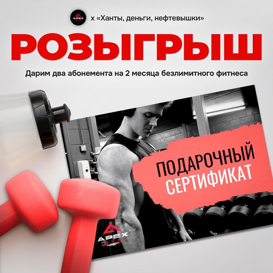 Напоминаем, что дарим два абонемента на два месяца безлимитного посещения в фитнес-зал APEX GYM в Сургуте