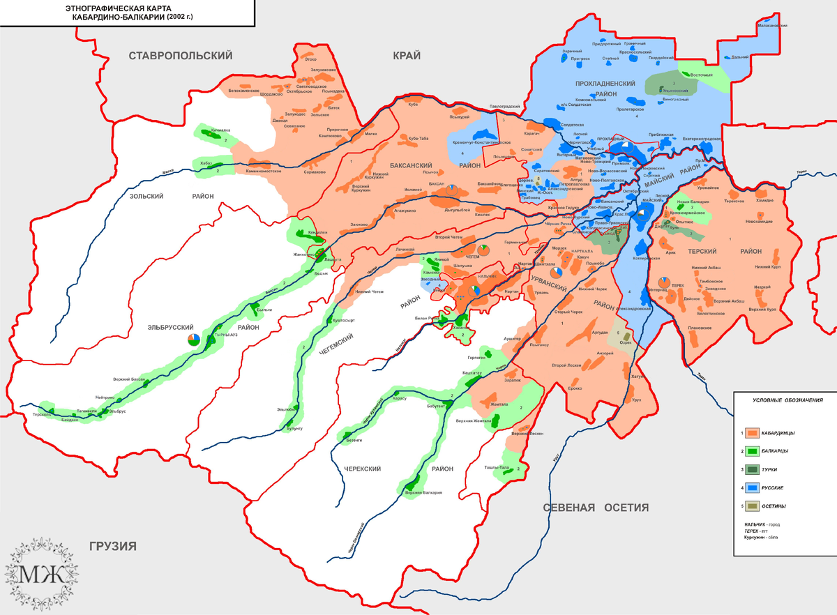 К моменту распада СССР, в Кабардино-Балкарии начинаются те же процессы, что и в Карачаево-Черкессии и других кавказских республиках. Межэтническая нестабильность и падение экономики в сельской местности, а также падение уровня жизни в целом привели к исходу из республики русских, особенно это касалось маленьких или смешанных населённых пунктов. В итоге, численность русских начала сокращаться. К радикальным изменениям это не привело, русские перестали иметь большинство в Нальчике. По аналогии с Карачаево-Черкессией, этнокарты по населённым пунктам у нас нет. Я сделал её сам, давайте же взглянем на неё.