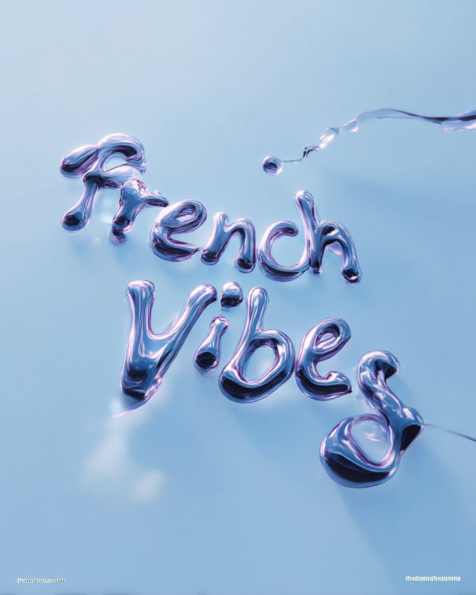 Создано на основе запроса: Poster featuring liquid style typography, fluid letters made from mercury spelling "French Vibes". Resting directly on a studio background