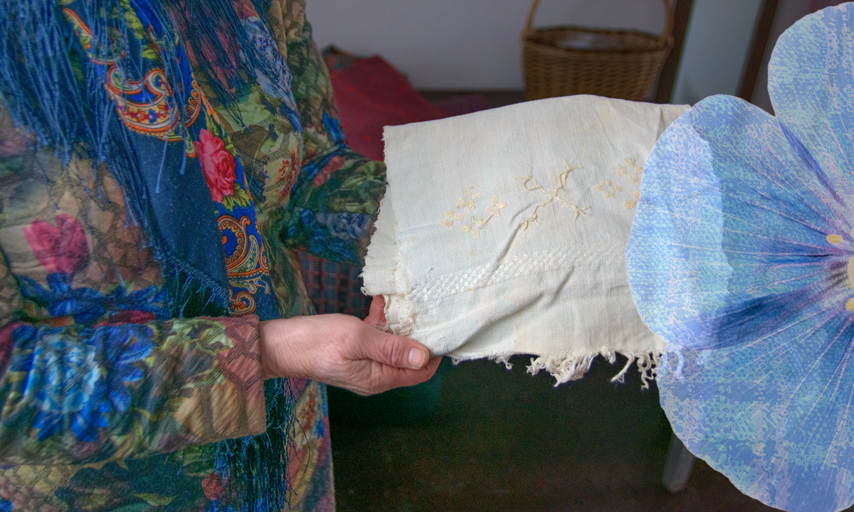 Во время раскладки рулонов ткани и прочих старинных вещей на нашей спонтанной фотосессии для «Тканых историй» у Кузьмовырского дома культуры вспомнились и рассказы местных старожилов о том, как отбеливали лен на мартовском снегу под слепящим весенним солнцем… А между тем Галина Николаевна Чиркова, помогая разложить ткани, порхает по крылечку и террасе клуба, как девочка, и, словно маг-волшебник, достает и достает тканые сокровища из плетеной корзины. Добротные тяжелые льняные юбки, сшитые сто лет назад, самотканые скатерти и полотенца с вышивкой, настоящие древние лапти, каким-то чудом сохранившиеся в целости и сохранности, большие и маленькие, грубые и тонкие, в клетку и полоску рулоны ткани, старинная мужская рубашка – местами выцветшая и потертая, не иначе, как первой половины прошлого века, и по ней видно, что долго и верно служила своему хозяину, а то и нескольким, переходя от поколения к поколению…