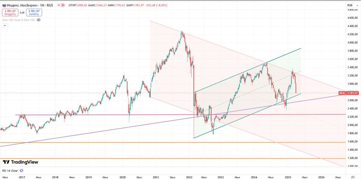 В ответ на пост Тут мне правильно напомнили, что у нас есть еще и падающий канал, который стартовал осенью 2021 года и его тоже нужно держать в голове Отрисовал оба канала. Формально, если компании не будет показывать прибыли, а налоги будут расти, то индекс может вполне перейти к снижению. Но обычно в сырьевых экономиках происходит девальвация и сырьевики начинают тянуть индекс вверх. Но это работает в условиях мирной жизни и отсутствии ограничений. Есть о чем задуматься... #IMOEX