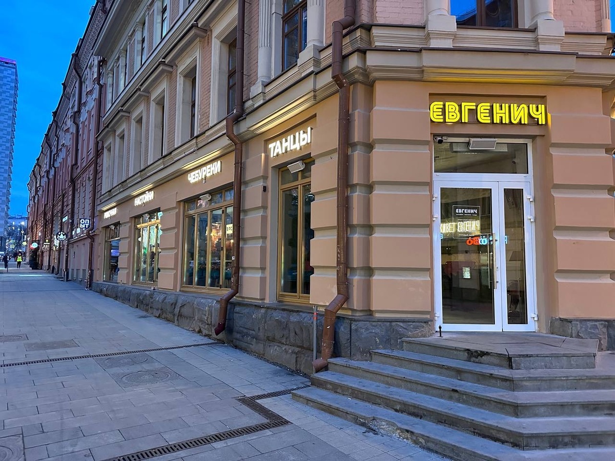 Немного нарушу хронологию обзоров про свои походы по Рюмочным Череповца , и вернусь примерно на 2 года назад в февраль 2023 года, когда состоялось официальное открытие новой Рюмочной «Евгенич» от солиста группы «Руки Вверх» Сергея Жукова. Развив достаточно популярную сеть танцевальных баров в Москве и регионах, которые кстати называются также как и группа, Сергей решил обратится к более понятному и простому формату Рюмочных. Название для нового заведения было выбрано по имени героя одного из туповатых российских сериалов, которого и сыграл Сергей. ⠀ Открылась рюмочная в самом центре Москвы по адресу: ул. Арбат, д.6/2. ⠀ В новой Рюмочной действительно очень много позаимствовано от питерской «Ларисочной», начиная от Ковров с неоновыми надписями в интерьере, и заканчивая подачей блюд на восточных тарелках и некоторыми позициями в меню. ⠀ На фасаде вывеска «Рюмочная. Настойки. Чебуреки. Танцы» (помните, да? «Чебуреки. Водка. Роскошь.») ⠀ . На входе вас встречает ростовая фигура того