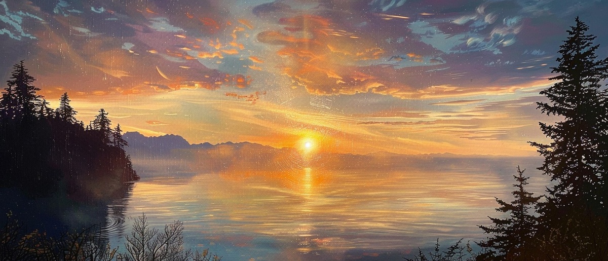 Создано на основе запроса: San Juan islands, painting in acrylic, professionally painted, unique, sunset, hyperrealistic, mist, crystalline
