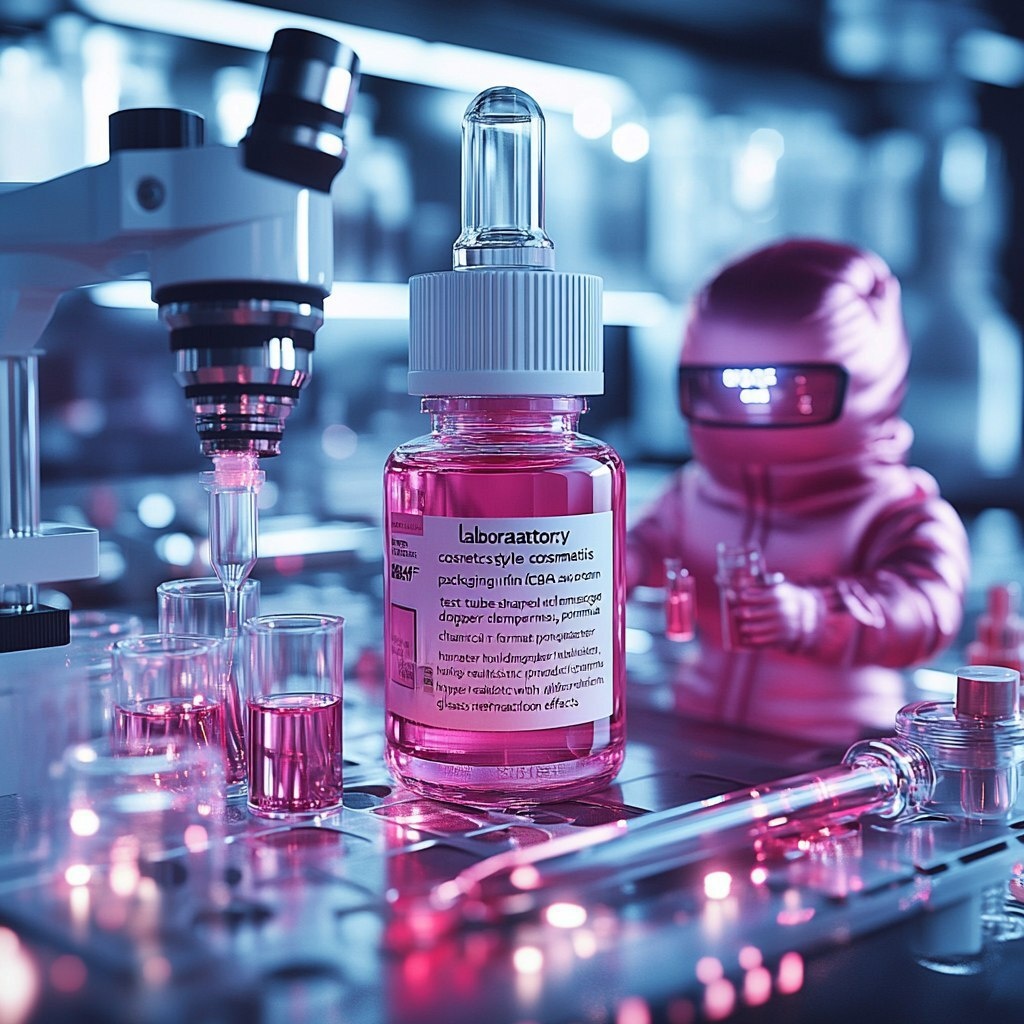 Создано на основе запроса: "laboratory style cosmetics packaging in #C8A4FF and #FFB574, test tube shaped serum with microscope inspired dropper, chemical formula patterns, popmart character holding beaker, hyper-realistic product photography with glass refraction effects"