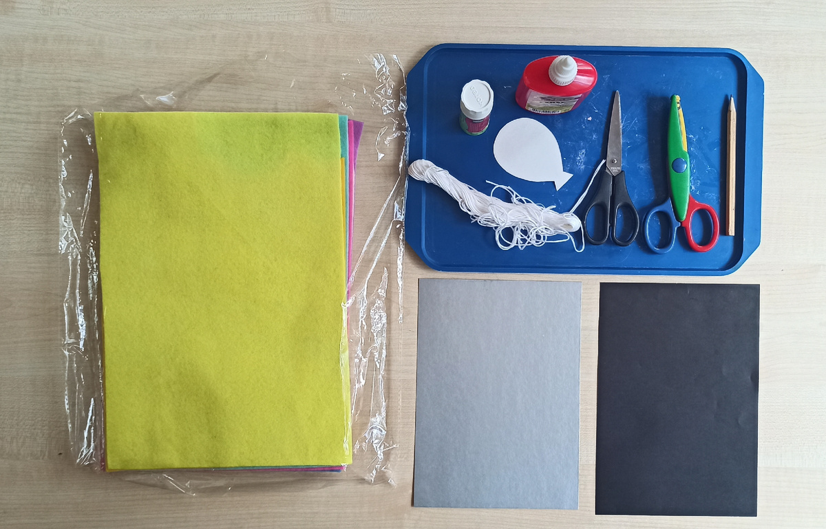 Скоро у моей напарницы будет день рождения. Мы с ребятами решили смастерить в подарок открытку своими руками. Между майскими праздниками было немного ребят в саду и достаточно свободного времени. Мы решили сделать открытку с воздушными шарами - яркую и необычную, из фетра. 1. Нарезаем чёрную бумагу небольшими полосками шириной приблизительно 1 см с помощью фигурных ножниц. Располагаем лист вертикально и режем полоски слева направо. Это нужно для того, чтобы при наклеивании они были по размеру картона (не длиннее и не короче). 2. Наклеиваем полоски на картон через небольшие промежутки клеем-карандашом снизу доверху. 3. Рисуем карандашом небольшие воздушные шарики на листах фетра (у нас их 9 штук), размером приблизительно 5-6 см, можно круглой или овальной формы. Мы использовали шаблон. 4. Вырезаем шарики. 5. К каждому шарику привязываем нитку. Я нарезала длиной 30 см, с запасом. 6. Наклеиваем шарики на картон с помощью клея ПВА, начиная с середины листа и двигаясь вверх, наклад